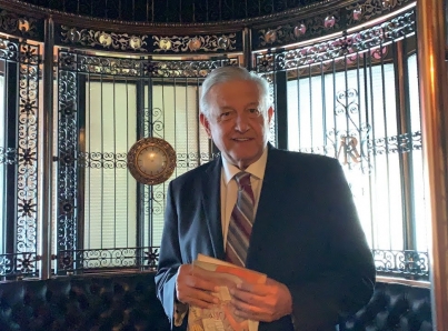 Al entrar a su oficina se encuentra con Gabriel Orozco, a quien dice considerar uno de los mejores pintores de México, así como con la secretaría de Cultura, Alejandra Fraustom y el asesor de Presidencia, Lázaro Cárdenas Batel.