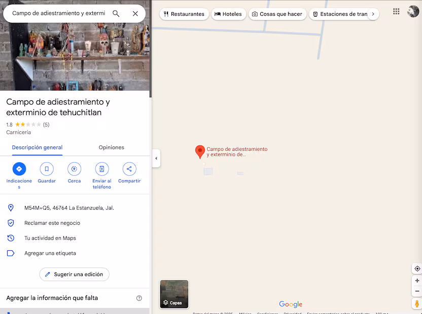 El impacto de este hallazgo fue tal que la ubicación exacta del sitio, denominado “Campo de adiestramiento y exterminio de Teuchitlán”, apareció en Google Maps, bajo la categoría de «carnicería».