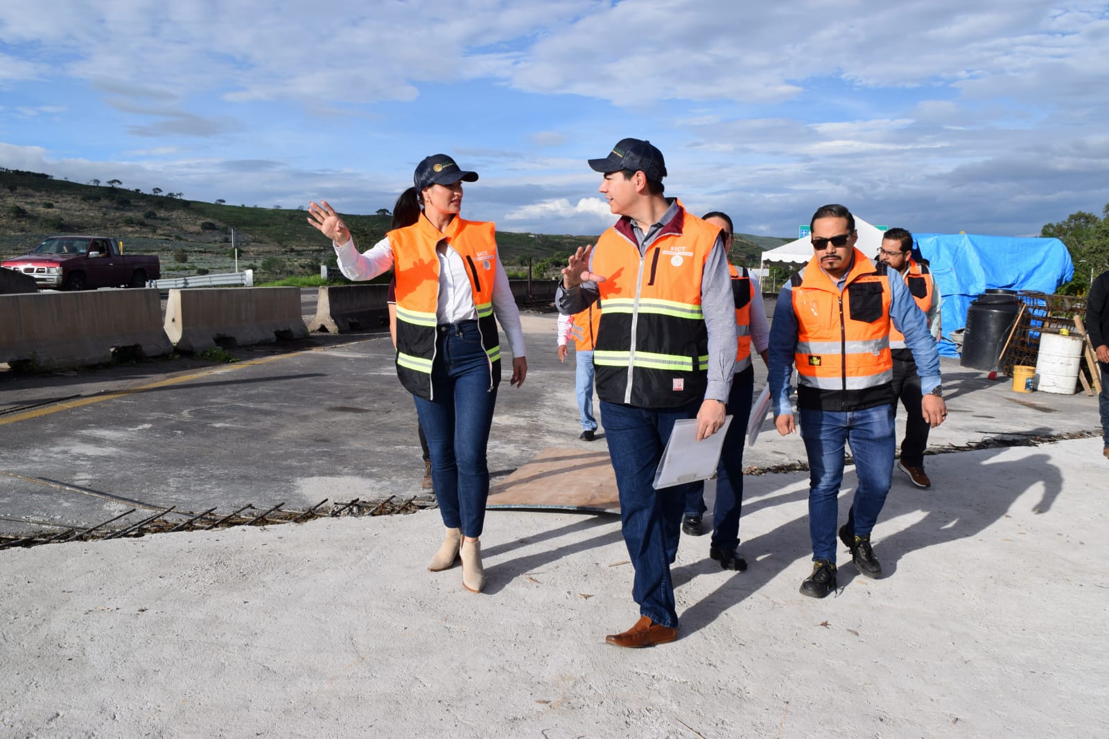 Autoridades de la Secretaría de Infraestructura, Comunicaciones y Transportes (SICT) realizaron una visita de supervisión para verificar los avances en la reconstrucción del puente en Zapotlanejo, Jalisco. La gira fue encabezada por el Coordinador de Centros de la SICT, Mtro. Carlo Benítez Ojeda, junto con la Directora General del Centro SICT Jalisco, Dra. María Padilla Romo.
