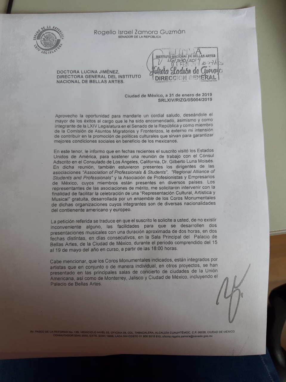 El INBAL pone a disposición de la sociedad la solicitud del senador Rogelio Israel Zamora y la versión pública del convenio correspondiente autorizada por la Subdirección Jurídica del Instituto.
