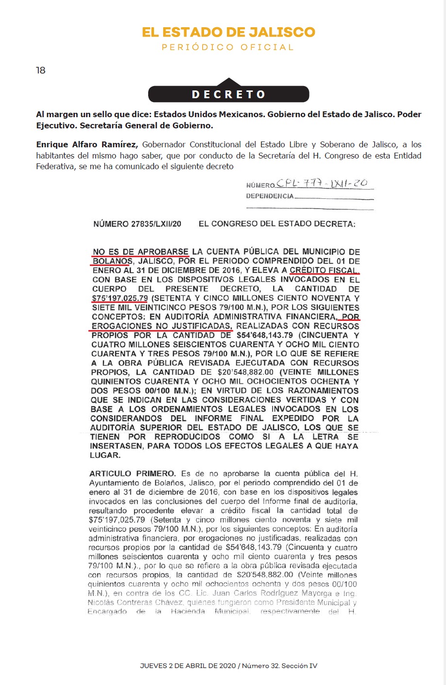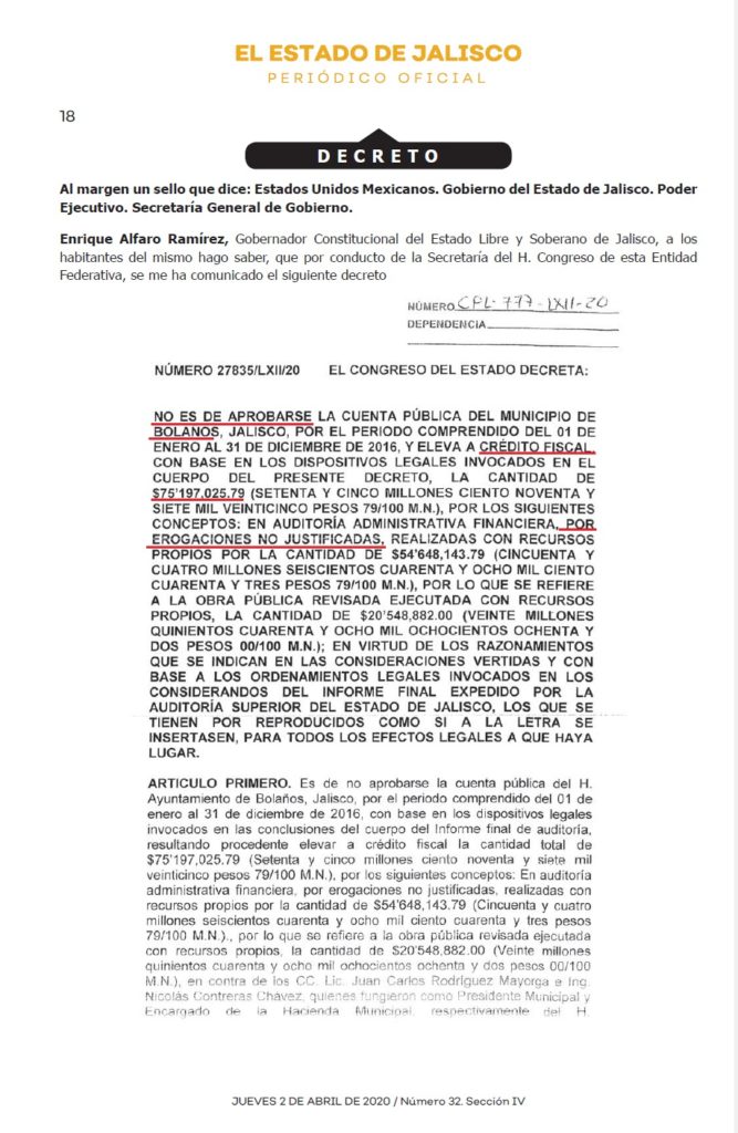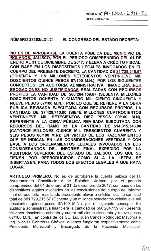 El primer crédito se debe a importantes irregularidades en el gasto del dinero público del año 2016, cuando Juan Carlos Rodríguez Mayorga era el presidente del municipio, en ese año bajo el Decreto 27835/LXII/20 se señalan irregularidades por $75 millones 197 mil pesos.