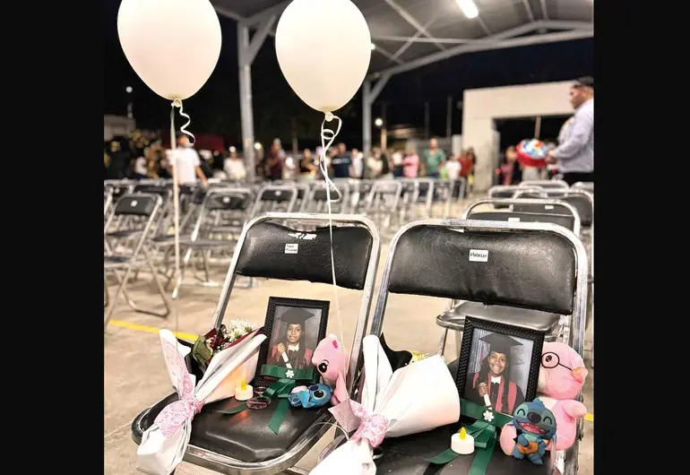 Los espacios fueron ocupados por un retrato, veladora, su diploma y un globo en memoria de las gemelas Meredith y Medilyn, quienes murieron a balazos mientras abrazaban a su hermana menor en Hermosillo, Sonora, en un crimen perpetrado por la pareja de su madre.