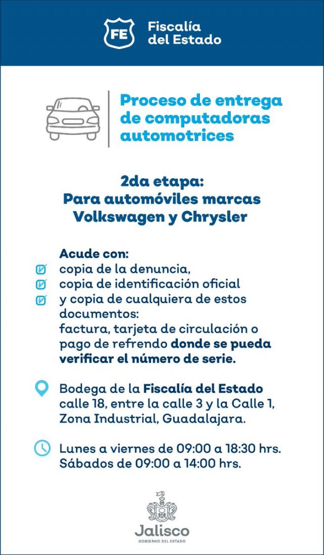 A partir de este 27 de junio las víctimas de robo de computadoras de vehículos de la marca Volkswagen pueden presentarse a las instalaciones de la calle 18 entre las calles 1 y 3, en la Zona Industrial, para la entrega de sus aparatos.