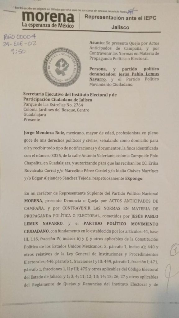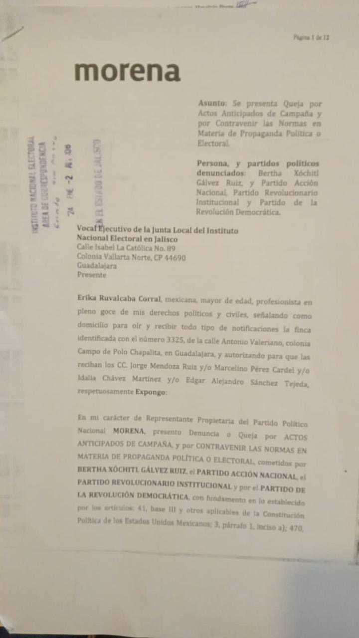 La Coordinadora en Jalisco de la pre candidata presidencial única de la Coalición “Sigamos Haciendo Historia”, Dra. Claudia Sheinbaum, Merilyn Gómez Pozos, presentó denuncias ante el IEPC y el INE, contra Pablo Lemus de MC y Xóchitl Gálvez de la Alianza PRI-PAN-PRD, por actos anticipados de campaña.