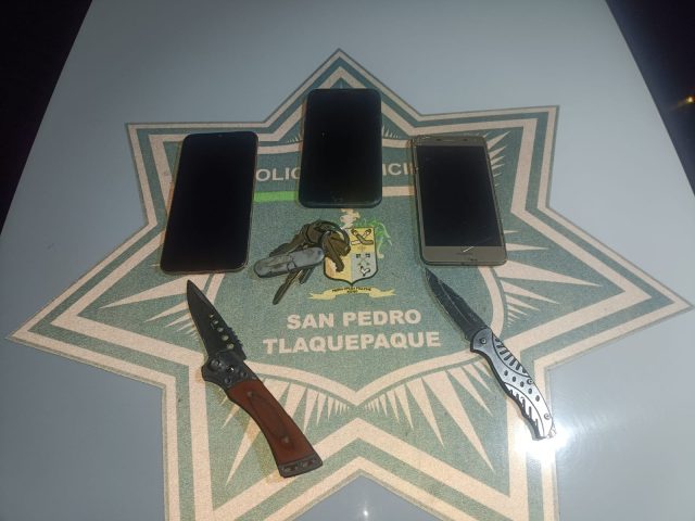 Posteriormente, los policías avistaron la camioneta señalada en la intersección de las calles Patria y Ahuehuetes, en la colonia Loma Bonita Ejidal. Al marcar el alto al vehículo, se procedió a realizar una revisión precautoria, donde se encontraron la mochila y el teléfono celular que habían sido sustraídos de la víctima, así como dos teléfonos adicionales y dos armas blancas.