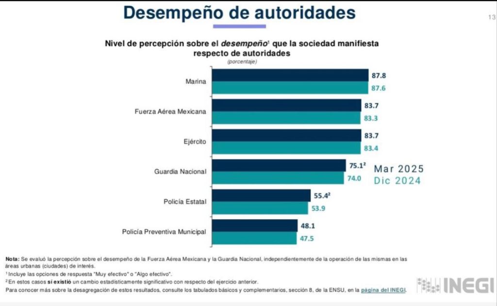 Por otro lado, también se observó un ligero incremento en la confianza y percepción del desempeño de la Policía Estatal. La confianza en la corporación pasó de 55.5 a 56.3 puntos, mientras que la percepción del desempeño aumentó de 53.9 a 55.4 puntos en el mismo lapso.