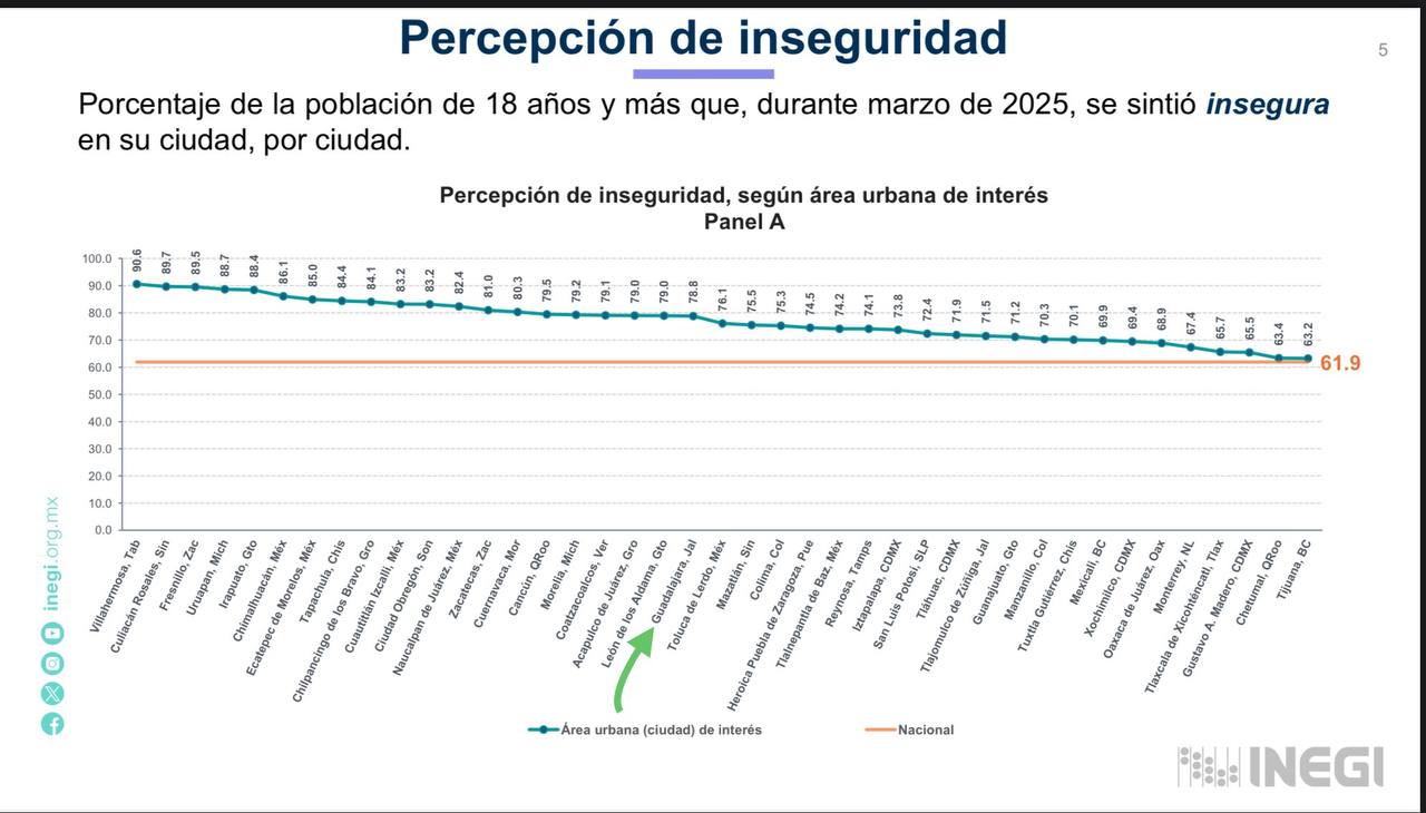 Según el informe, la percepción de inseguridad en Jalisco pasó de un 58.2 en diciembre de 2024 a un 55.06 en marzo de 2025, tomando en cuenta el promedio de seis municipios analizados por INEGI en la entidad. En el área metropolitana, la percepción disminuyó en los cinco municipios estudiados (Zapopan, Guadalajara, Tonalá, Tlaquepaque y Tlajomulco), pasando de 63.74 a 61.48 puntos.