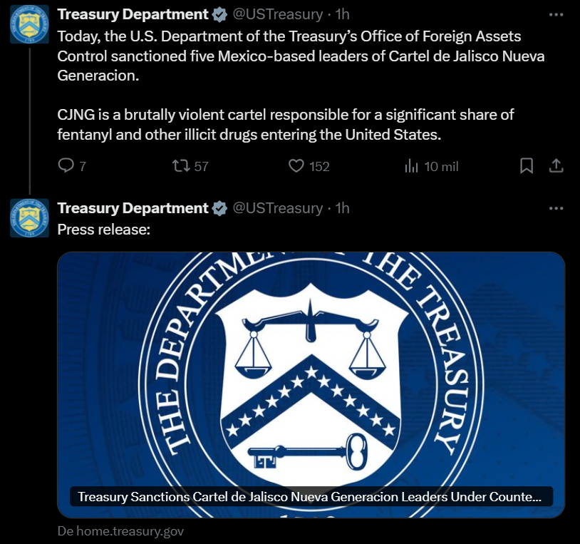 Según declaraciones del secretario del Tesoro, Scott Bessent, “el régimen de terror del CJNG en México y su tráfico de fentanilo a Estados Unidos han destruido innumerables vidas inocentes”. Las sanciones implican el bloqueo de todos los bienes e intereses en propiedades de estas personas en territorio estadounidense, así como en aquellas en posesión o control de ciudadanos o entidades estadounidenses. Asimismo, cualquier organización en la que las personas sancionadas tengan una participación superior al 50% también queda bloqueada, buscando cortarles el acceso a recursos financieros y operativos.