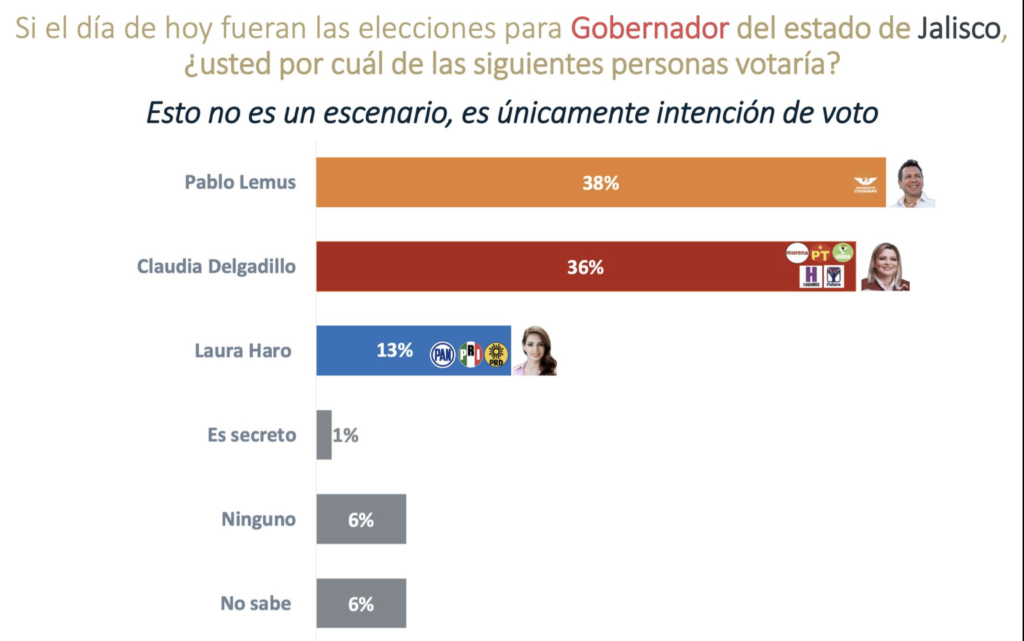 Nuevas encuestas confirman que Pablo Lemus es puntero en la intención del voto para las elecciones a Gobernador de Jalisco. El candidato ha incrementado simpatías mientras que Claudia Delgadillo, de Morena, se mantiene en la segunda posición.