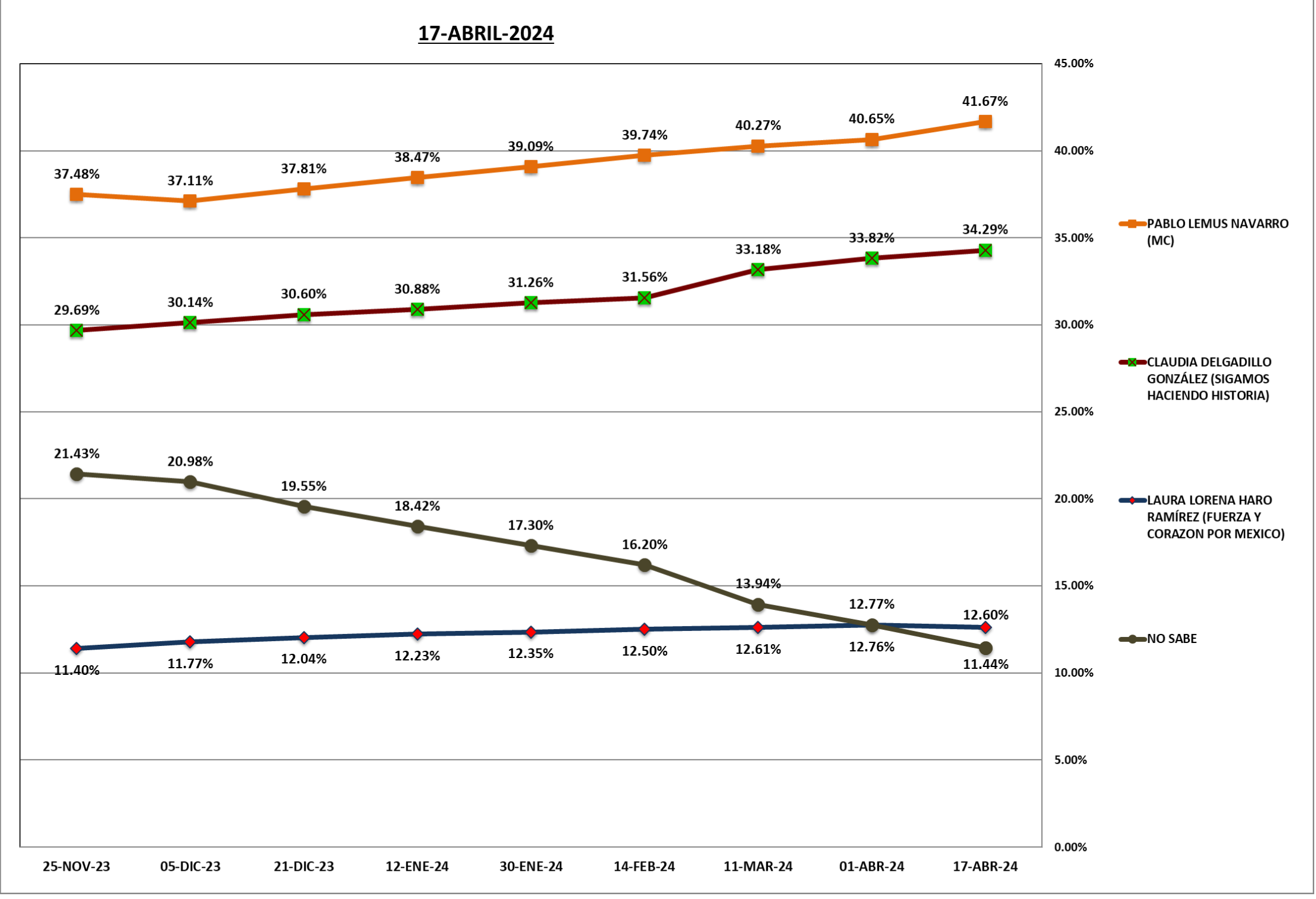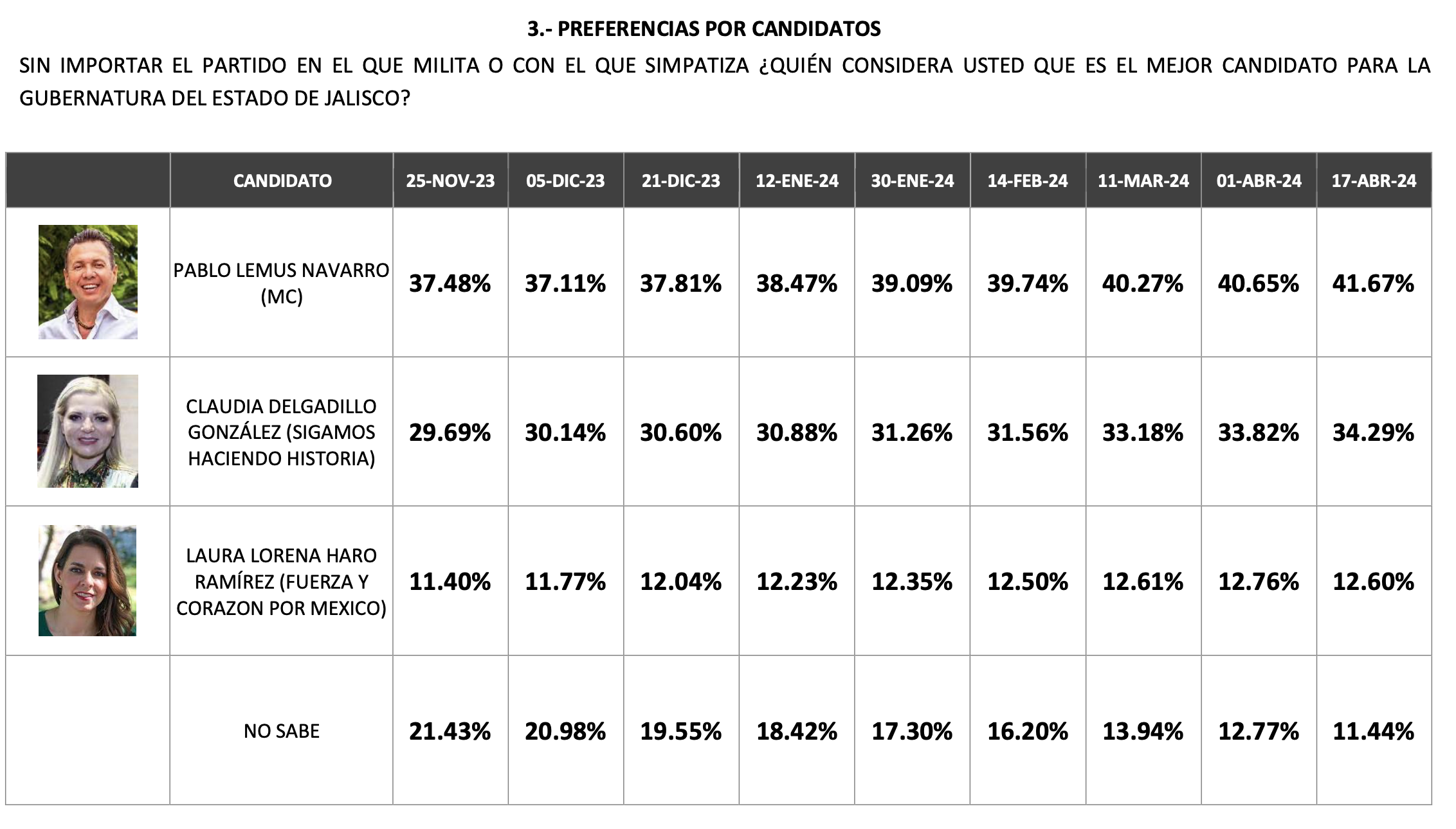 La empresa “Índice, Información y Análisis” ha realizado 9 levantamientos estadísticos del 25 de noviembre al 17 de abril, esto es, precampaña y campaña y en cada uno de sus seguimientos Lemus se mantiene al frente, e incluso aumentando sus preferencias.