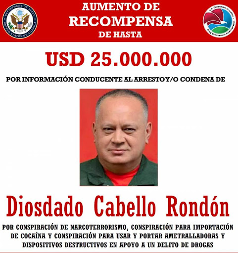 Tras la captura de Nicolás Maduro, el pasado sábado en una operación militar estadounidense, el ministro de Interior y Justicia de Venezuela, Diosdado Cabello, encabeza ahora junto al terrorista indio Dawood Ibrahim, la lista de las mayores recompensas ofrecidas por Estados Unidos: 25 millones de dólares, igual a la que se ofreció inicialmente por el líder de Al Qaeda, Osama bin Laden.