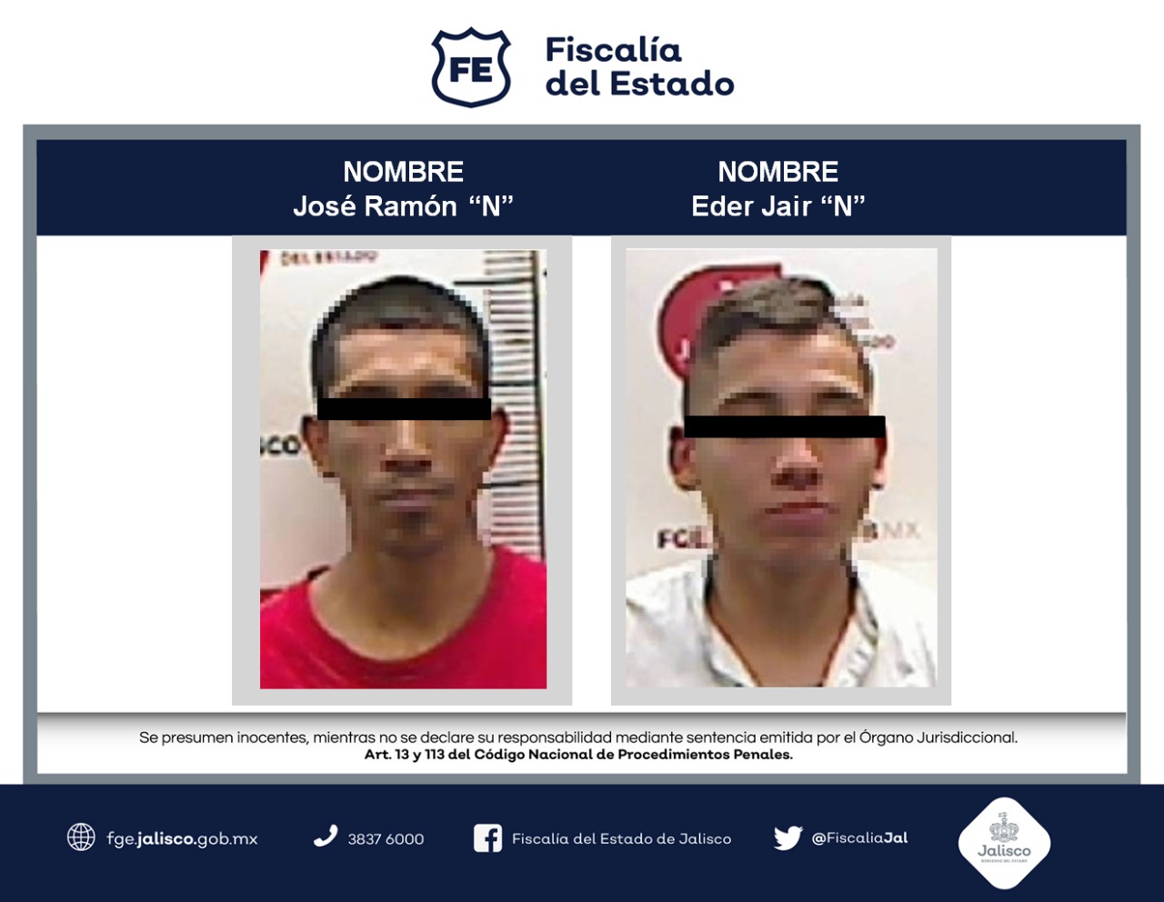 Los detenidos son José Ramón “N”, de 28 años de edad, quien dijo vivir en la colonia Loma Dorada, en Tonalá y Eder Jair “N”, de 21 años de edad, vecino de la colonia Insurgentes, en Guadalajara.