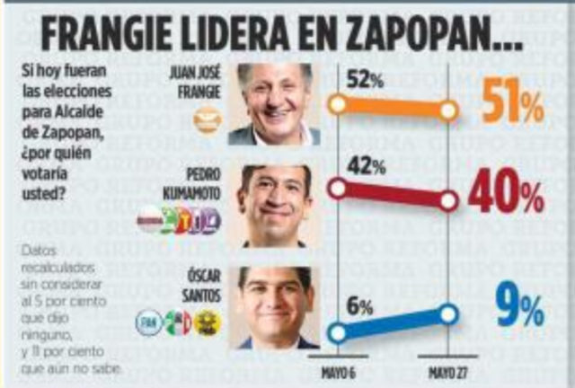 De acuerdo con la encuesta del Grupo Reforma que se publicó el martes, Frangie lidera la preferencia con más de 11 puntos de ventaja, con una preferencia efectiva del 51 %. Pedro Kumamoto, el ex candidato independiente y ahora candidato de Morena, se queda atrás con apenas el 40 %.