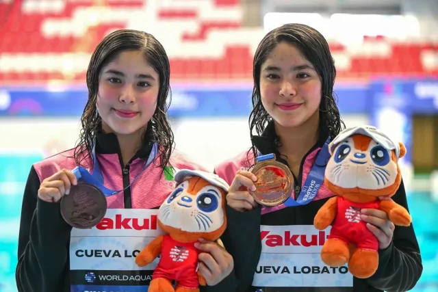 Las gemelas mexicanas Lía y Mía Cueva ganaron la medalla de bronce en la final de sincronizados trampolín tres metros en el Mundial de Natación Singapur 2025.