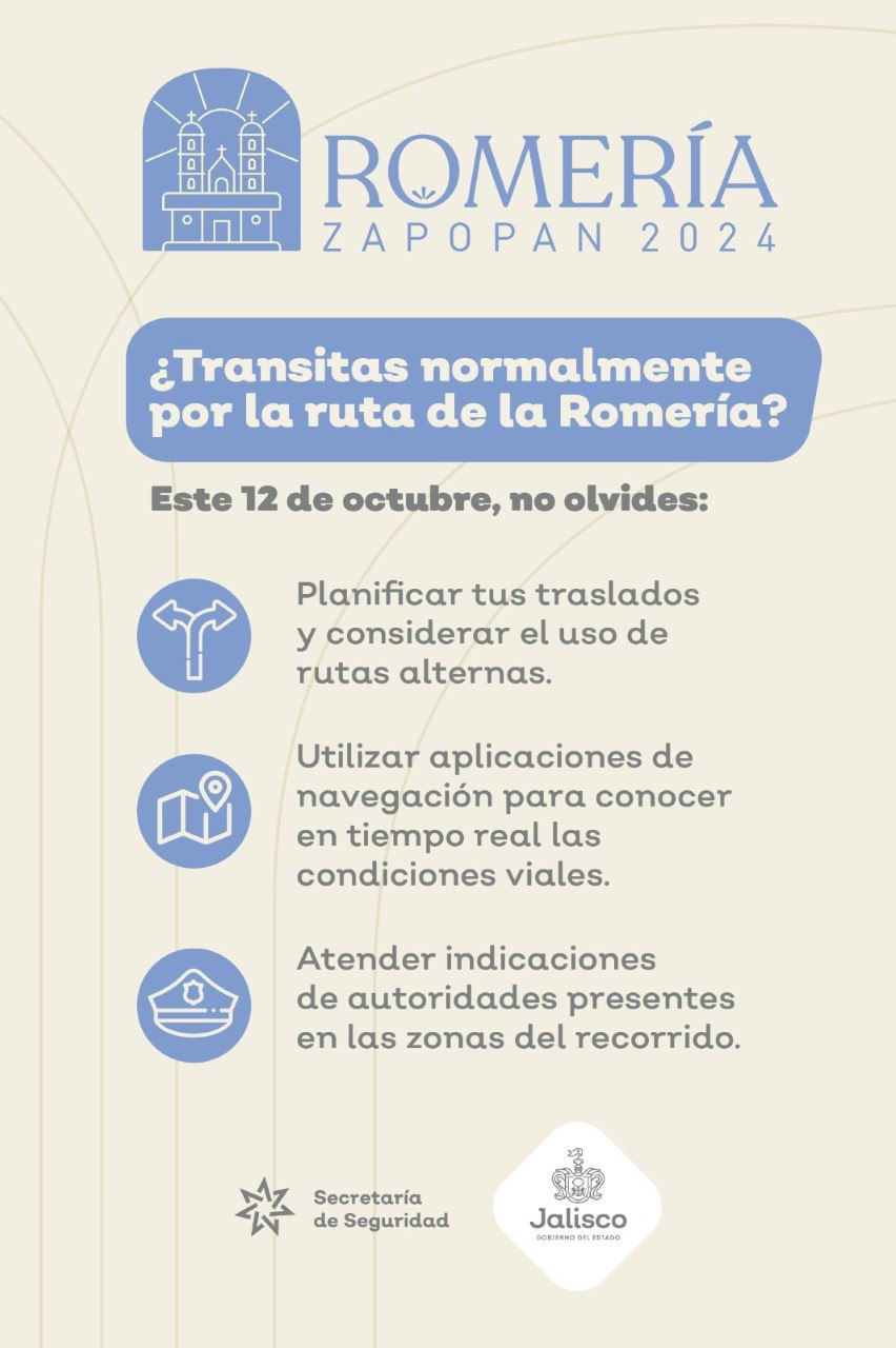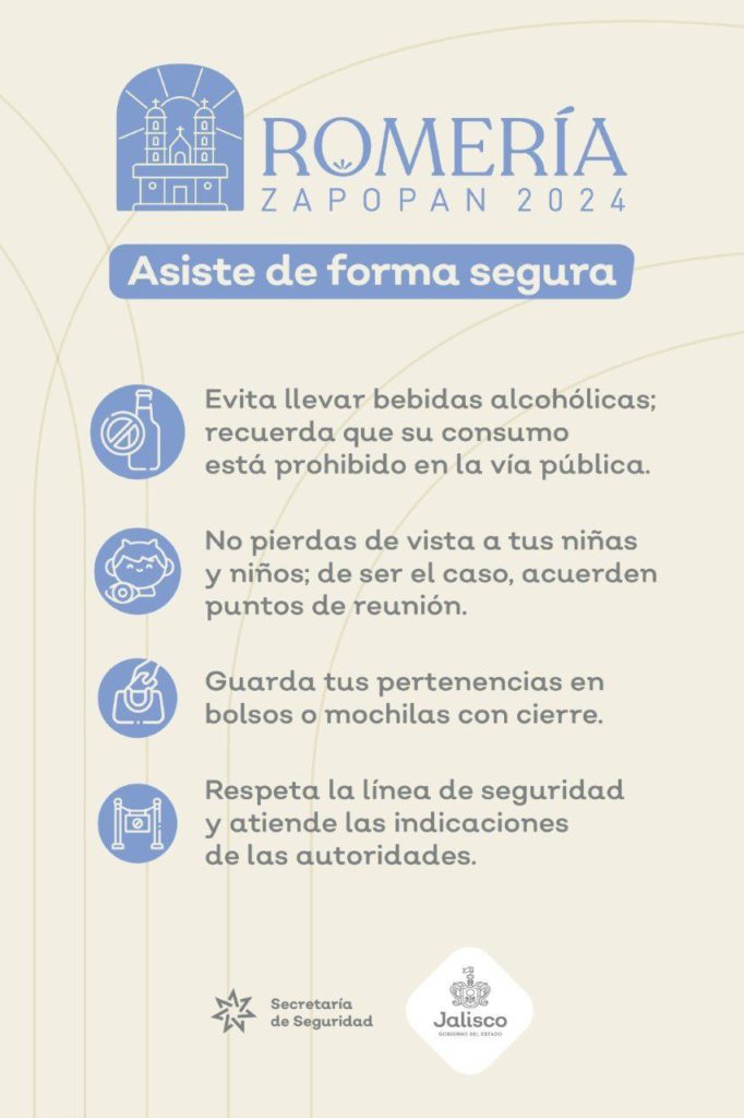 La Secretaría de Seguridad del Estado (SSE) a través de la Comisaría de la Policía Vial implementará un operativo especial con la finalidad de resguardar la seguridad de los participantes en la tradicional Romería de la Virgen de Zapopan.