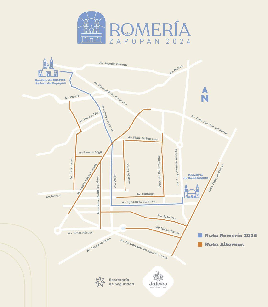 La procesión, que iniciará aproximadamente a las 6:30 de la mañana del sábado 12 de octubre, partirá de la Catedral de Guadalajara y finalizará en la Basílica de Zapopan, tomando el siguiente recorrido: