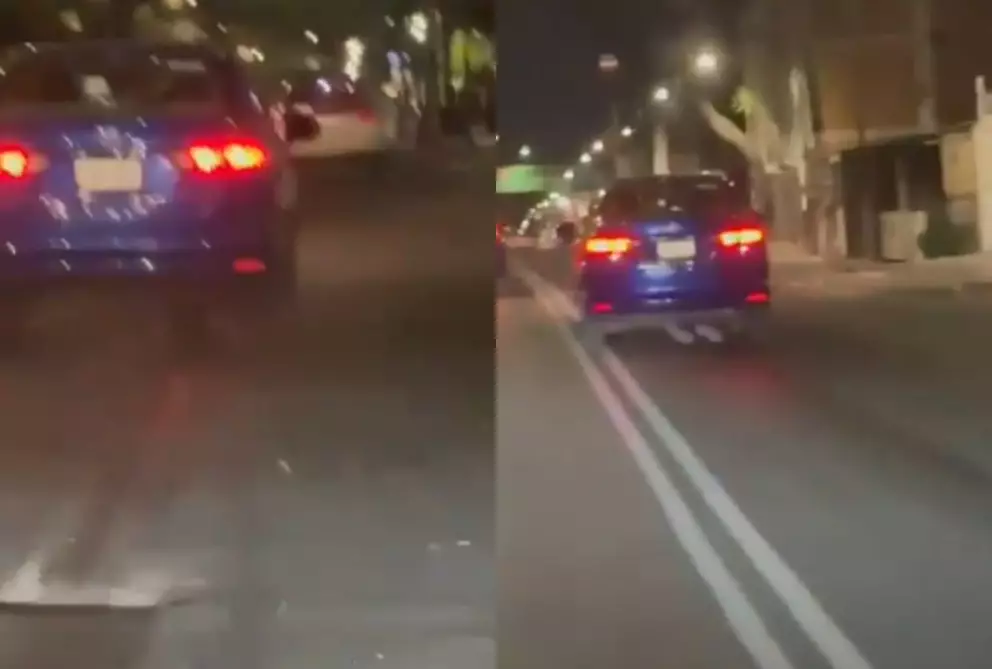 En redes sociales comenzaron a circular videos donde se observa cómo avanza el auto azul a gran velocidad, mientras el cuerpo de la víctima queda atrapado debajo de las llantas, y sólo se le alcanzan a ver los pies, así como el rastro de sangre que va dejando en el pavimento.