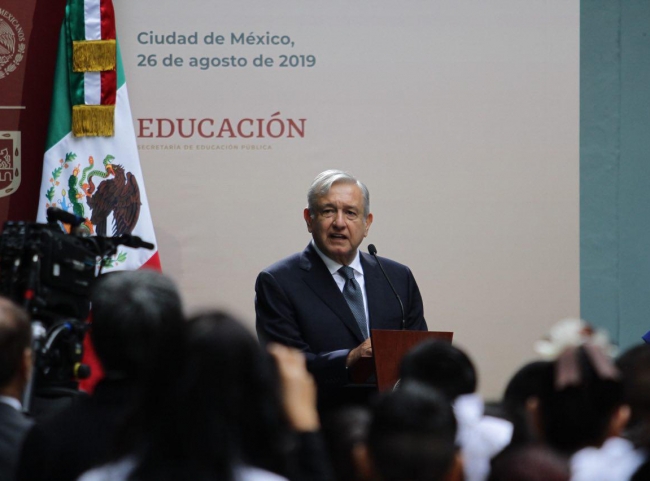 El presidente Andrés Manuel López Obrador inauguró esta mañana el ciclo escolar 2019-2020, deseó éxito a todos los niños, niñas y jóvenes, y reiteró su compromiso de que los maestros nunca más serán ofendidos como sucedía en años anteriores.