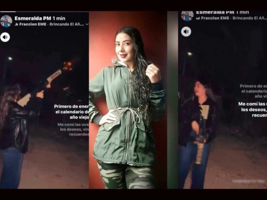 En una de las grabaciones, difundida por la propia Esmeralda Pizarro en sus redes sociales, se le observa accionando un fusil FX-05 Xiuhcóatl, mientras de fondo suena la canción “Brincando el Año”, del grupo Los Elementos de Culiacán.