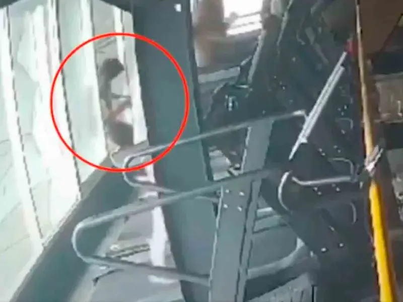 La mujer de repente tropieza, directamente hacia una ventana e incluso en las imágenes, puede verse intentando agarrarse al marco de la ventana antes de caer tres pisos.