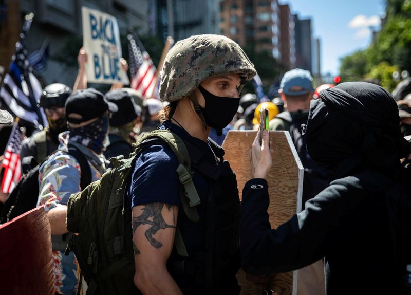 Agentes de policía fueron golpeados con piedras y botellas durante una protesta en la ciudad de Portland, en Oregón, a última hora del sábado, dijo la policía, y hubo enfrentamientos entre grupos de manifestantes rivales en el centro de la ciudad a primera hora del día.