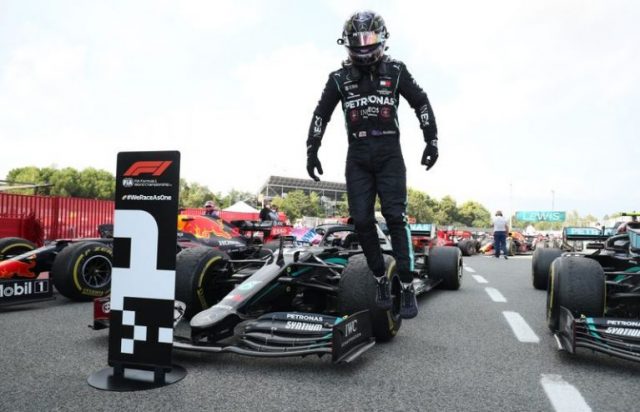 El campeón de Fórmula 1 Lewis Hamilton ganó el domingo el Gran Premio de España por cuarto año consecutivo, para alcanzar un registro de 156 podios en su carrera y ampliar su ventaja en el campeonato a 37 puntos.