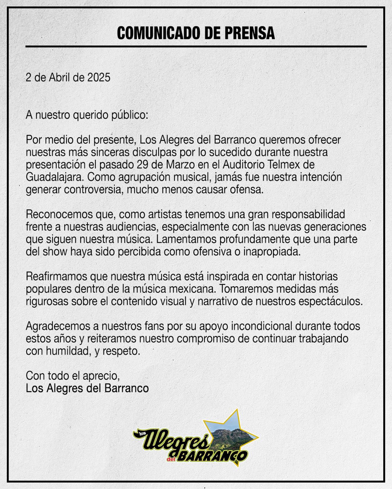 “Reafirmamos que nuestra música está inspirada en contar historias populares dentro de la música mexicana. Tomaremos medidas más rigurosas sobre el contenido visual y narrativo de nuestros espectáculos”, se destacó en el documento.