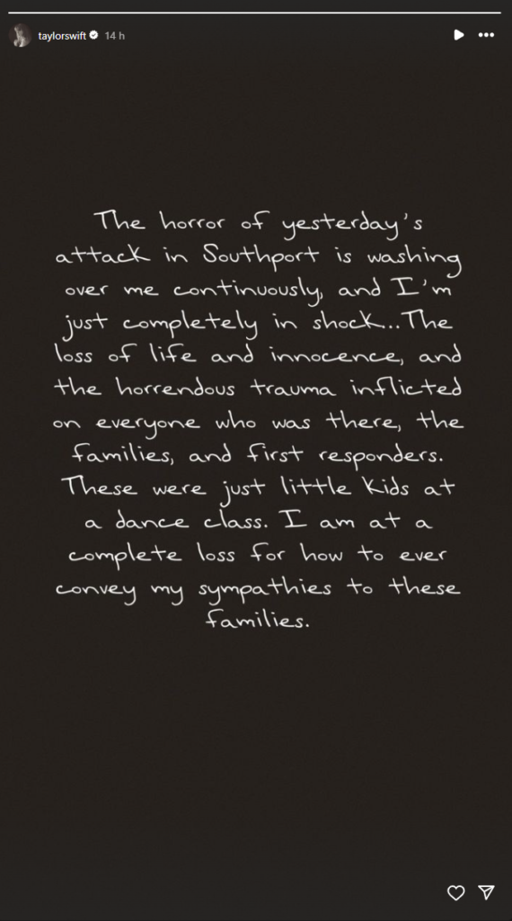 En un mensaje difundido en Instagram, la famosa estrella de talla internacional escribió: “El horror del ataque de ayer en Southport me inunda continuamente y estoy completamente impactada. (…) Eran sólo unos niños en una clase de baile. No sé cómo transmitir mis condolencias a estas familias”.