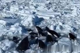 Una manada de más de 10 orcas o ballenas asesinas, quedaron atrapadas en el hielo a la deriva frente a la costa de Hokkaido en el norte de Japón.
