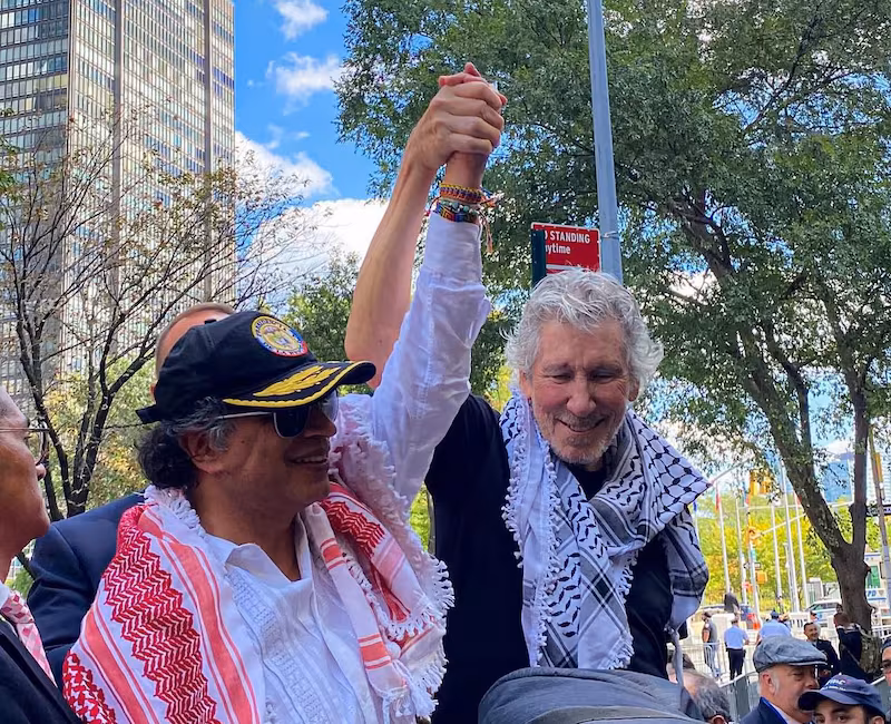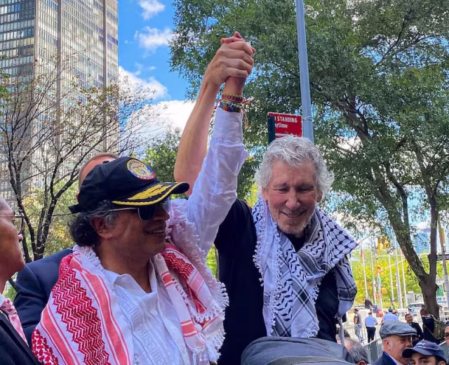 Gustavo Petro levantó una bandera palestina y habló con un megáfono ante los manifestantes mientras era custodiado por personal de seguridad. A su lado estuvo el cantante británico Roger Waters, cofundador de la banda Pink Floyd, y el embajador de Colombia en Washington, Daniel García-Peña.