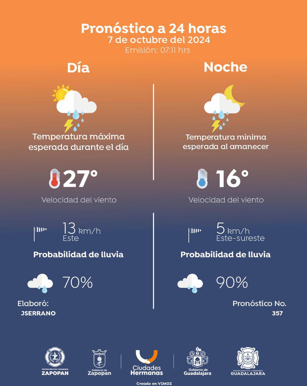 Para el Área Metropolitana de Guadalajara (AMG) se prevé un día con cielo mayormente nublado y un incremento en la probabilidad de lluvia por la tarde y hacia el anochecer, acompañado de nubes de tormenta.