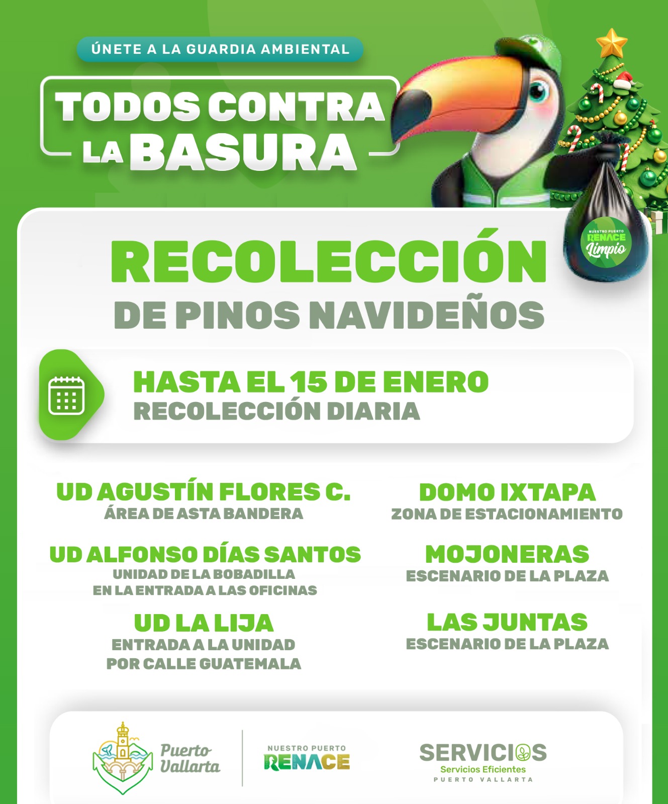 El Gobierno de Puerto Vallarta mantiene habilitados diversos centros de acopio para la recolección de pinos navideños, como parte de la estrategia municipal “Todos contra la basura”, impulsada por la Dirección de Servicios Eficientes.