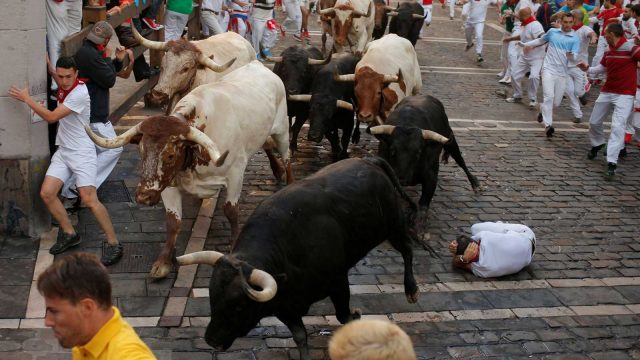 Un herido por asta de toro y otros cinco contusionados dejó el quinto encierro de los Sanfermines 2019, con toros de la ganaderia de Victoriano del Río, fue algo más largo que días anteriores por el despiste de un astado en la plaza.