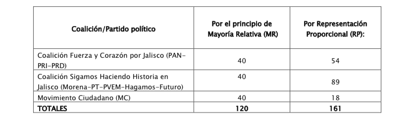 El Instituto Electoral y de Participación Ciudadana de Jalisco (IEPC) informa que en total se presentaron 120 solicitudes de registro de candidaturas a diputaciones locales de mayoría relativa y 161 de representación proporcional para el Proceso Electoral local Concurrente 2023-2024.