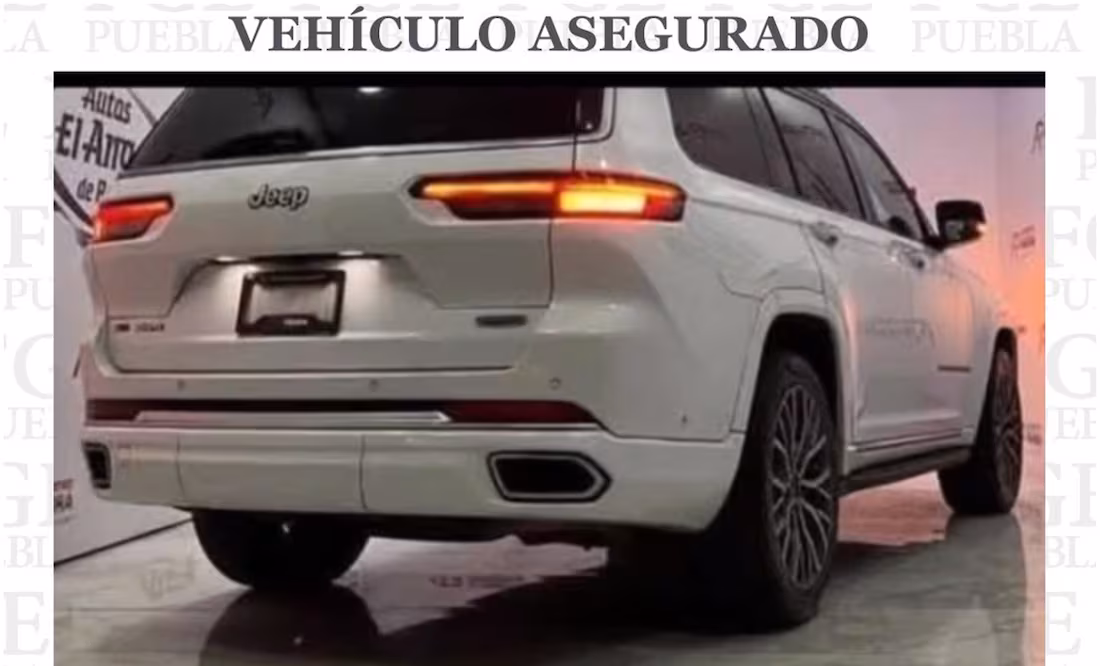 La Fiscalía General de Puebla informó que derivado de la investigación por robo de vehículo, se llevó a cabo el aseguramiento de la camioneta Jeep Grand Cherokee.