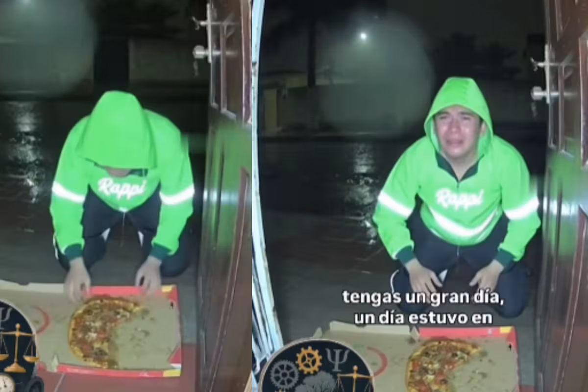 En las imágenes, se observa a un repartidor de pizza trabajando bajo la lluvia. Mojado y visiblemente cansado, el joven llega finalmente al domicilio del pedido, pero justo al llegar a la puerta, una mala pisada sobre el pavimento resbaloso cambia todo.