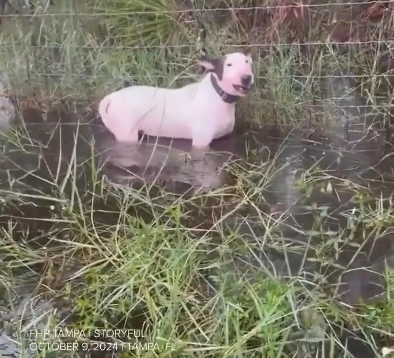 Agentes de la Patrulla de Carreteras de Florida, rescataron a un perro abandonado y atado a un cerco en una área inundada cerca de Tampa, en medio de la crisis causada por el huracán Milton.