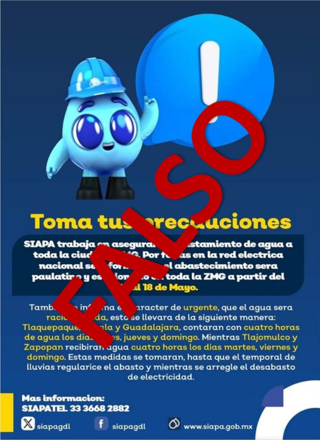 A través de sus redes sociales, el SIAPA pidió a la ciudadanía estar atenta a la información oficial, luego de que en distintos grupos circulara un comunicado falso, en el que se alerta que el abastecimiento de agua en la Zona Metropolitana de Guadalajara, será paulatino y racionalizado.