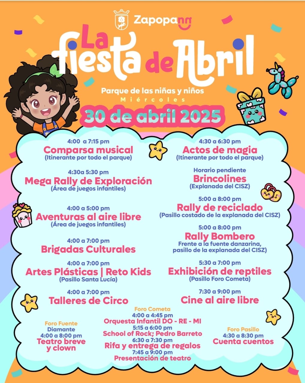 El próximo miércoles 30 de abril culmina la celebración organizada por el Gobierno de Zapopan en conmemoración del Día del Niño, que desde 2021 busca promover un espacio seguro, divertido y educativo para las infancias del municipio. La jornada final se llevará a cabo en el Parque de las Niñas y los Niños, donde se ofrecerán diversas actividades destinadas a fomentar la creatividad, la convivencia y el aprendizaje en familia.